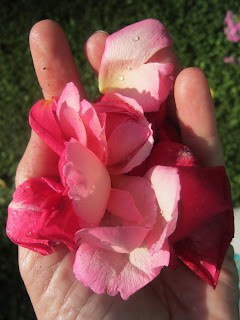 Amazing what Mother Nature’s storm can do in one hour. A lichen covered limb dropped, a moonflower bloomed and rose petals scattered. I never thought anything would be better than a just picked tomato sandwich but I have to admit a handful of petals is heavenly!