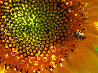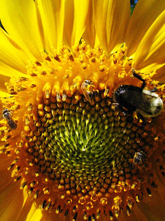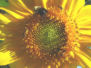 For the first time in years my sunflowers actually bloomed; If you look closely at the sunflowers there are 4 different bees on it. I noticed that different varities/species of bees, insects of all shapes and sizes and butterflies were all eating away at the same time – unlike humans who tend to differ too frequently.